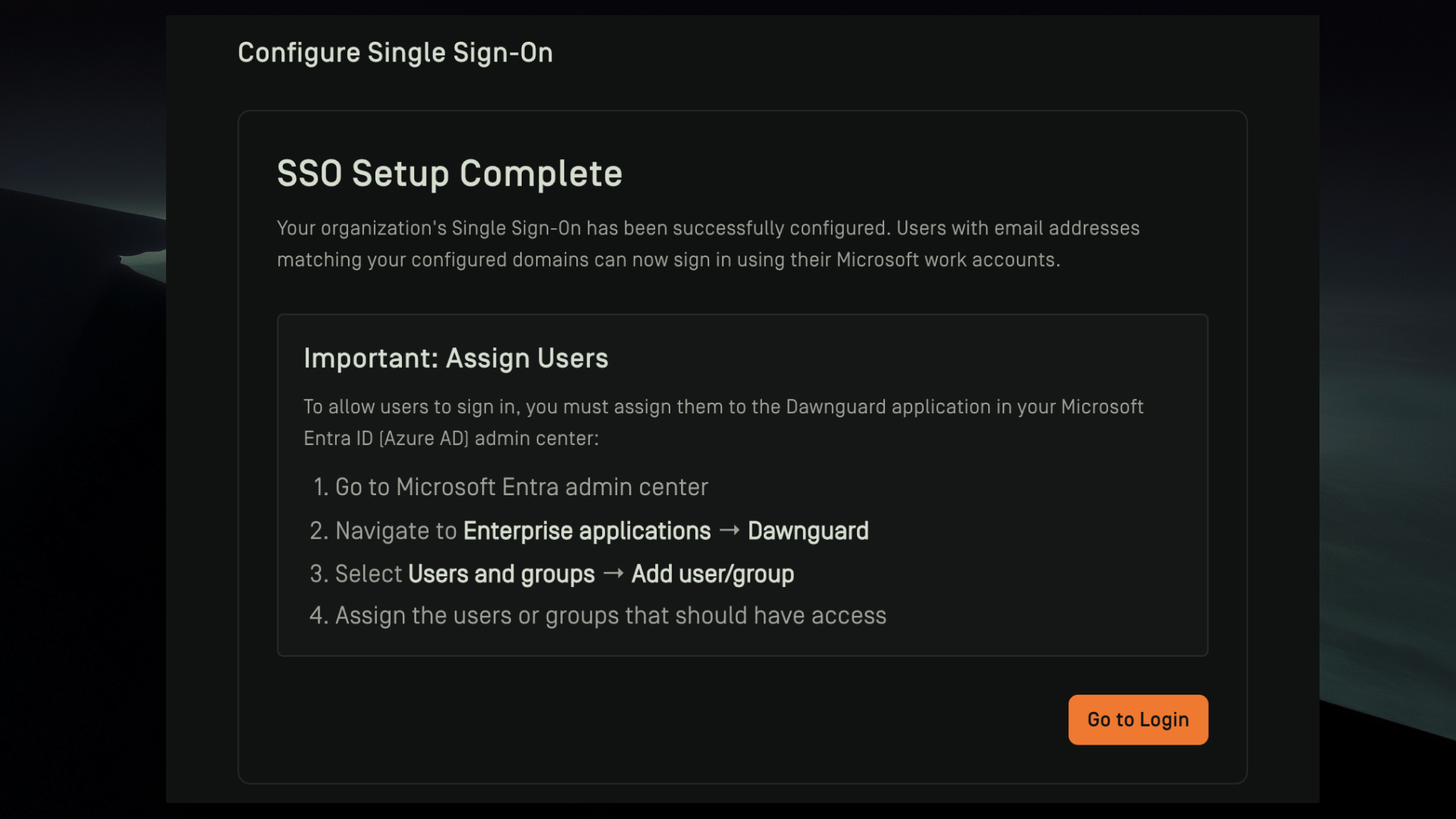 To login, you should navigate to the Azure portal and assign users to the newly created "Dawnguard One-Click Connect" Enterprise app to provide access to the system.